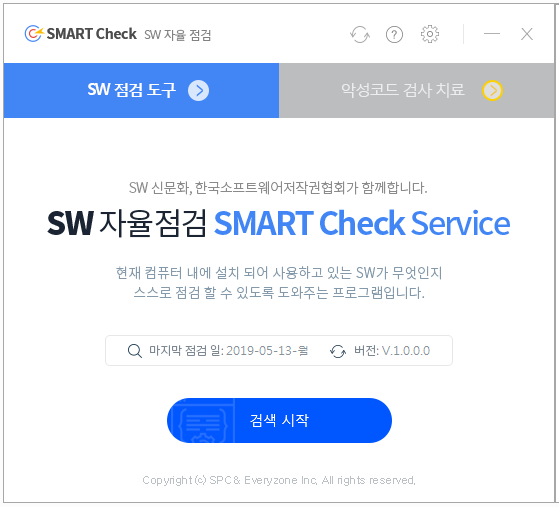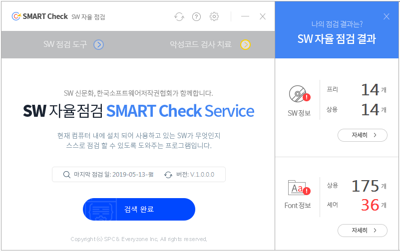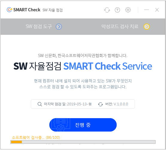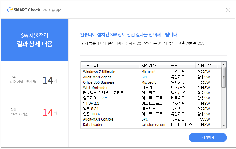* SMART Check SERVICE는 국내 최대 SW DB인 SAMDB를 활용하여 PC에 설치되어 있는 SW의 상용, 프리, 셰어, 공개여부를 확인할 수 있습니다. 또한 불필요하게 설치되어 있는 SW를 바로 삭제할 수 있습니다.