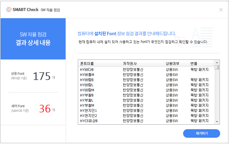 * 검색된 폰트파일이 상용, 셰어 폰트파일인지 확인하여 관리할 수 있습니다. - 악성코드 검색/치료
