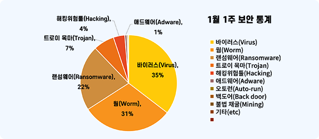 이번주에는 바이러스(Virus), 웜(Worm) 바이러스, 랜섬웨어(Ransomware)가 가장 많이 탐지된 것으로 나타났습니다. 바이러스(Virus) 35%, 웜(Worm) 바이러스 30%, 랜섬웨어(Ransomware) 22%,를 차지했습니다. 다음으로는 트로이 목마(Trojan) 7%, 해킹위험툴(Hacking) 4%, 애드웨어(Adware) 1%, 오토런(Auto-run), 백도어(Back door), 불법 채굴(Mining)순으로 탐지 되었습니다.