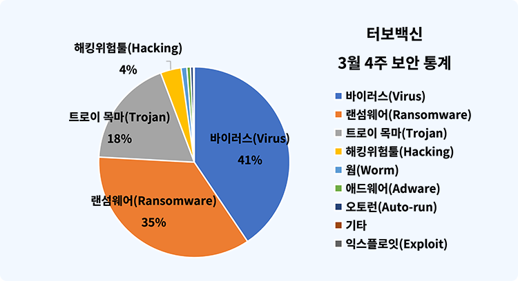이번주 전체 탐지는 바이러스(Virus) 41%, 랜섬웨어(Ransomware) 35%, 트로이 목마(Trojan) 18%, 순서로 탐지되었습니다. 다음으로 해킹위험툴(Hacking), 웜 바이러스(Worm), 애드웨어(Adware), 로 확인되며 오토런(Auto-run), 백도어(Back door), 익스플로잇(Exploit), 불법 채굴(Mining) 기타(etc)로 나타난 것으로 확인 되었습니다.