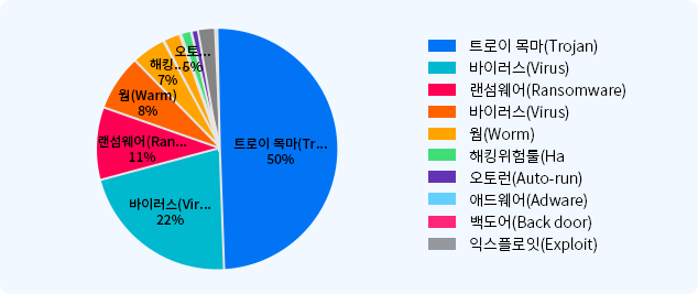 전체 탐지 수는 6246개로 악성코드 유형으로 트로이목마(Trojan)가 50%로 높은 비율로 탐지 되었습니다. 다음으로 바이러스(Virus)가 22%, 랜섬웨어(Ransomware) 11% 탐지 되었으며 웜(Worm)이 8%로 증가 하였습니다. 기타 애드웨어(Adware), 오토런(Auto-run), 백도어(Back door), 불법 채굴, 익스플로잇(Exploit)가 있었습니다.