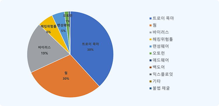 전체 탐지 수는 1,184개로 악성코드 유형으로 트로이목마(Trojan)가 38%로 높은 비율로 탐지 되었습니다. 뒤이어 웜(Worm)이 30%, 바이러스(Virus)가 19%, 랜섬웨어(Ransomware) 5% 탐지 되었습니다. 기타 애드웨어(Adware), 오토런(Auto-run), 백도어(Back door), 불법 채굴, 익스플로잇(Exploit)가 있었습니다.