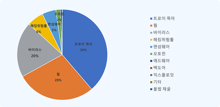 전체 탐지 수는 11,450개로 악성코드 유형으로 트로이목마(Trojan)가 39%로 높은 비율로 탐지 되었습니다. 뒤이어 웜(Worm)이 28%, 바이러스(Virus)가 20%, 랜섬웨어(Ransomware) 5% 탐지 되었습니다. 기타 애드웨어(Adware), 오토런(Auto-run), 백도어(Back door), 불법 채굴, 익스플로잇(Exploit)가 있었습니다.