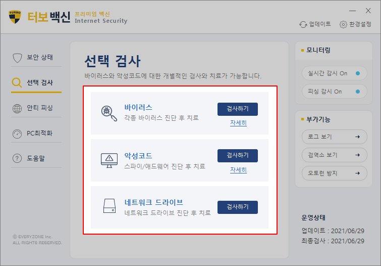 상황에 맞는 검사 방법으로 3가지를 선택하여 검사할 수 있고, 바이러스와 악성코드에 대한 개별적인 검사와 치료가 가능합니다. 또 세분화된 선택검사를 하면 정밀검사를 하는 것보다 필요한 영역과 유형에 대해 선택적으로 검사하여 시간을 아낄 수 있습니다.