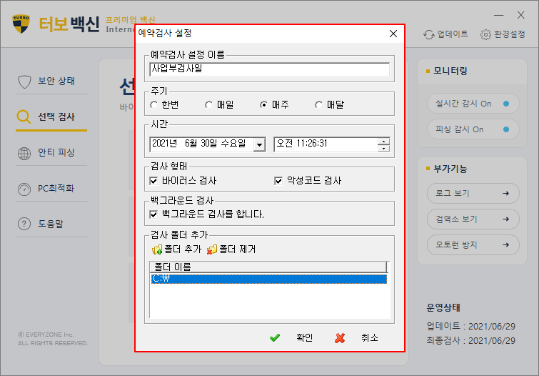 백신 검사에 대한 검사 세부사항을 설정하여 사용자가 원하는 주기에 자동 검사하도록 합니다.