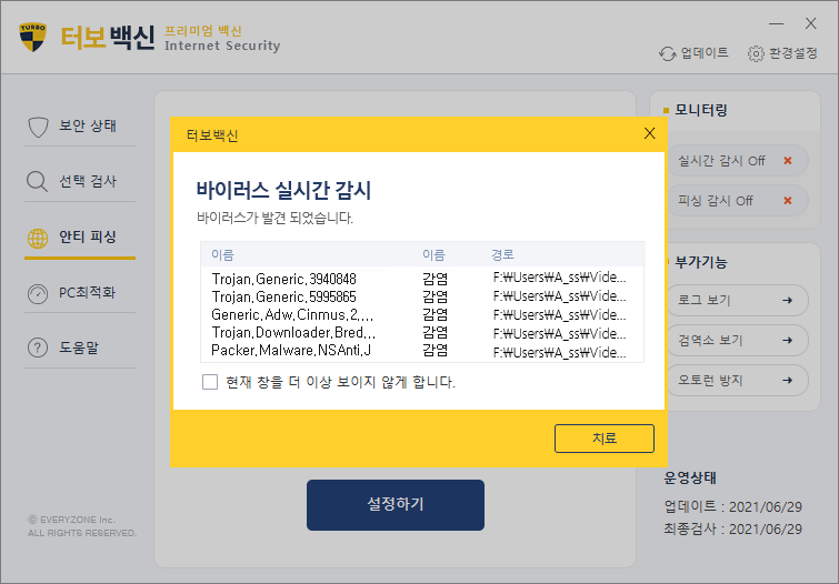 하루에도 수백에서 수천까지 바이러스와 악성코드가 위협하고 있습니다. 그렇기 때문에 처음 설치했을 때의 백신 상태만으로는 위험할 수 있습니다. 하지만, 터보백신은 항상 최신 바이러스에 대응하기 위해 매일 업데이트를 진행하고 있으니 자동 업데이트를 설정해두시는 것도 좋은 방법입니다.