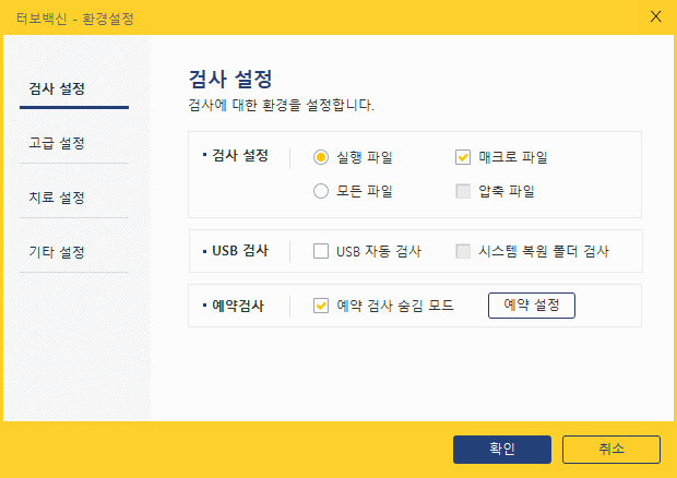 검사 설정, USB 검사, 예약 검사를 세부적으로 변경 하고 적용 할 수 있습니다.